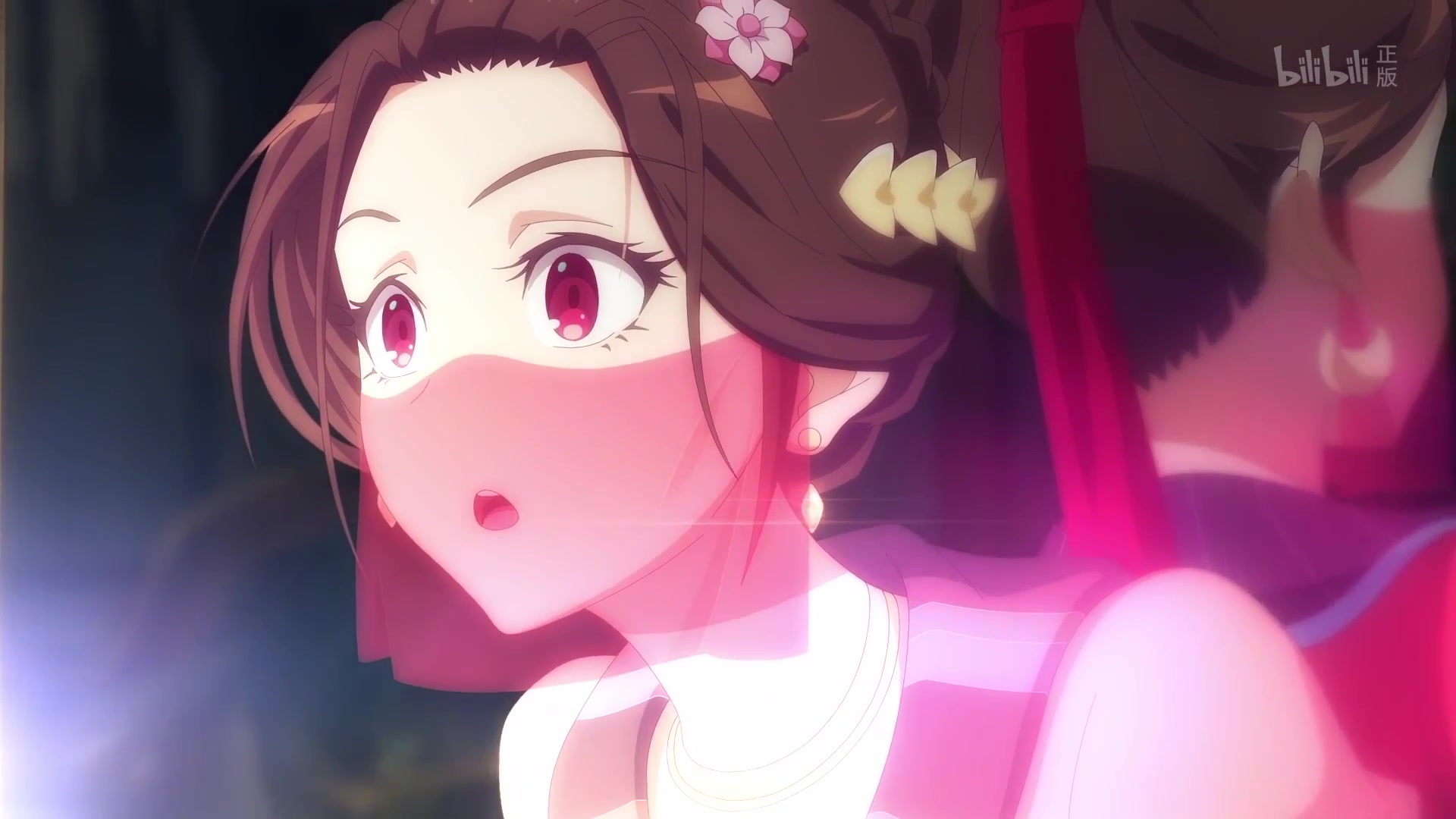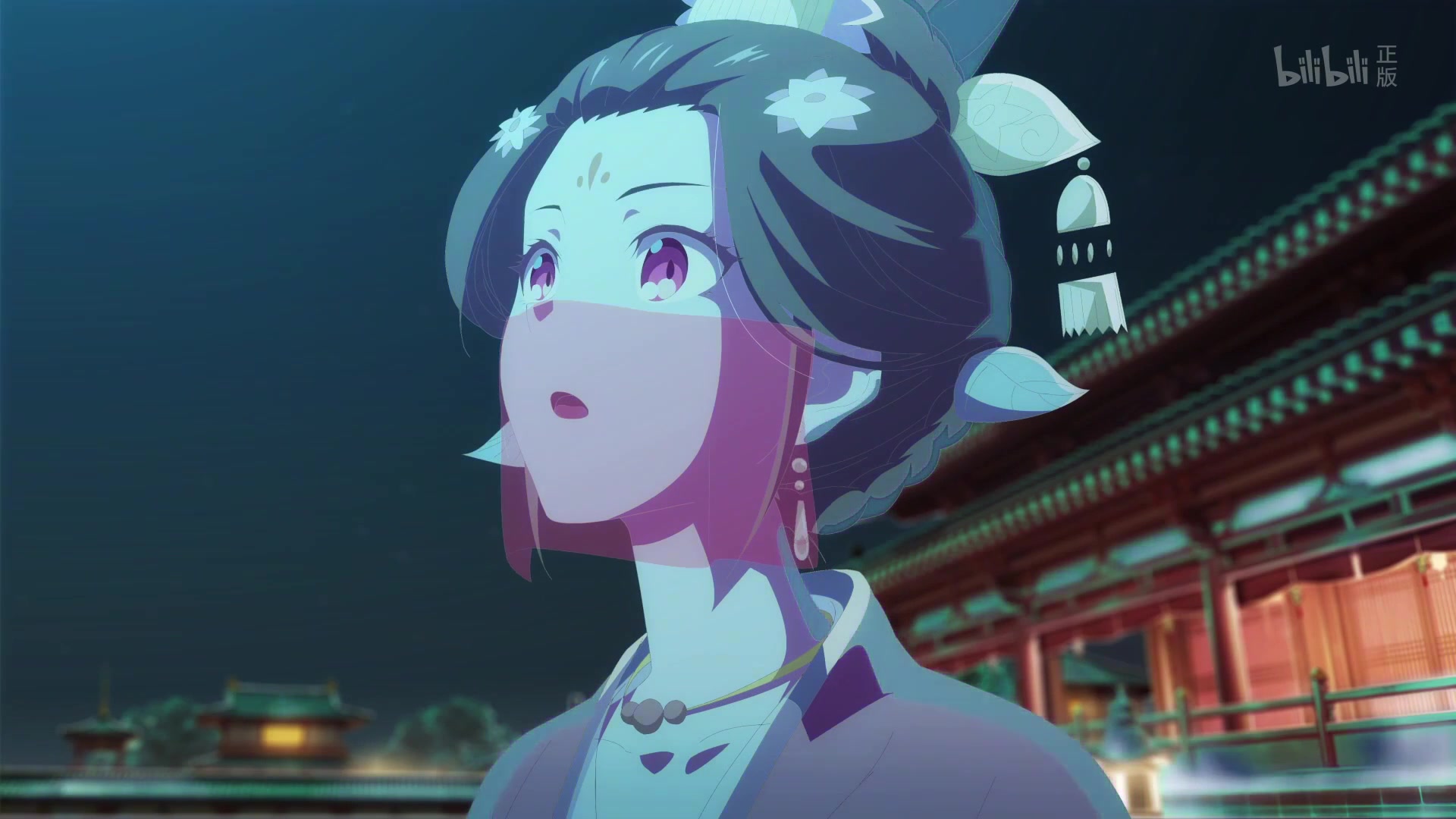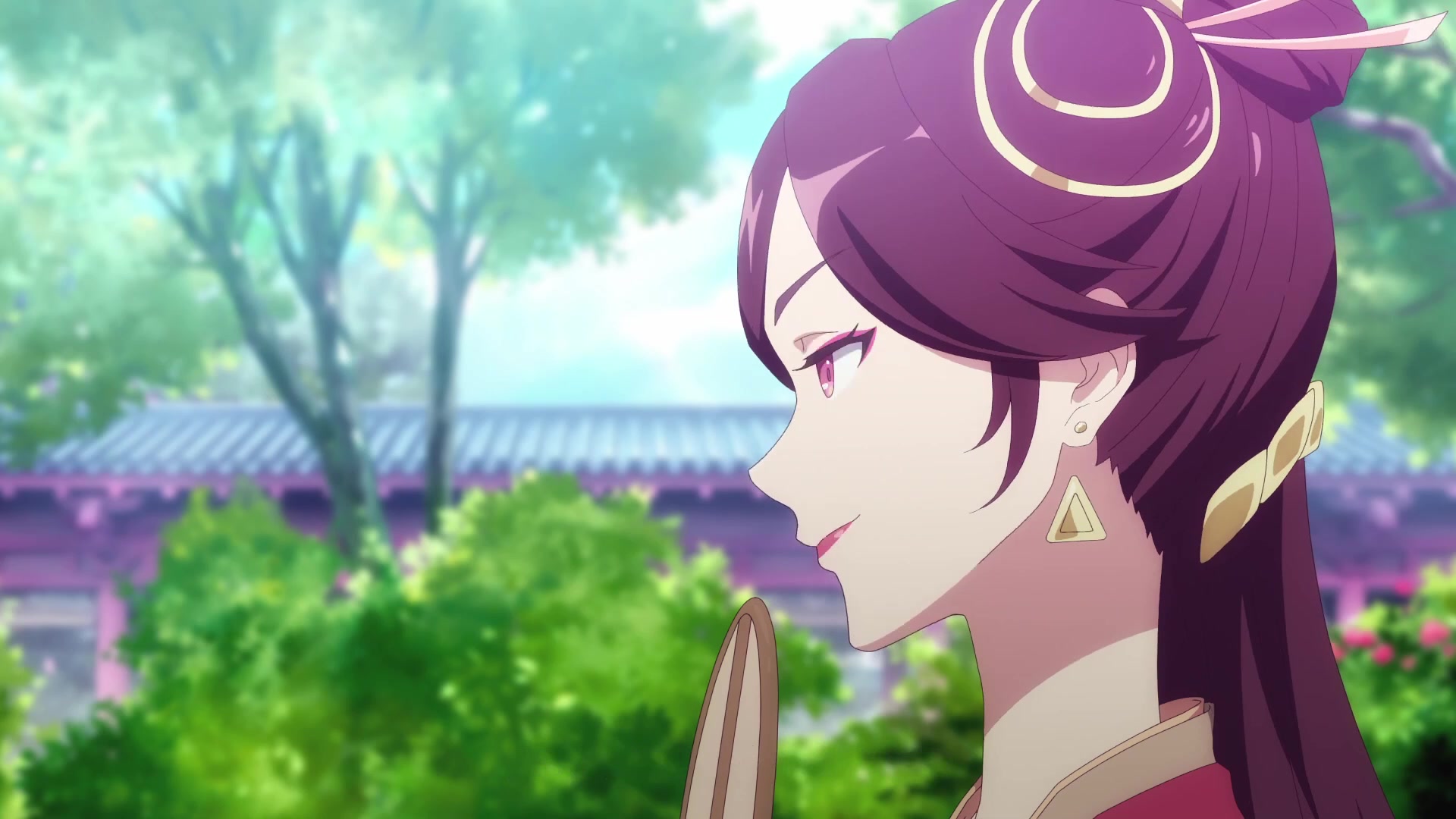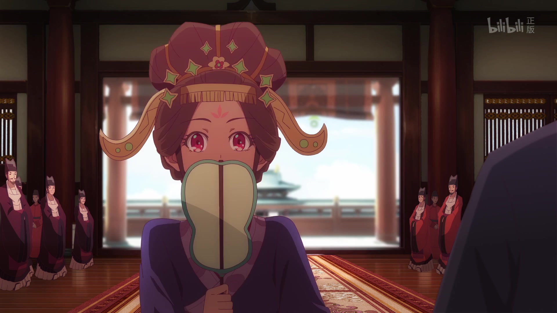 Лицо, прикрытое веером, похоже на цветок персика.