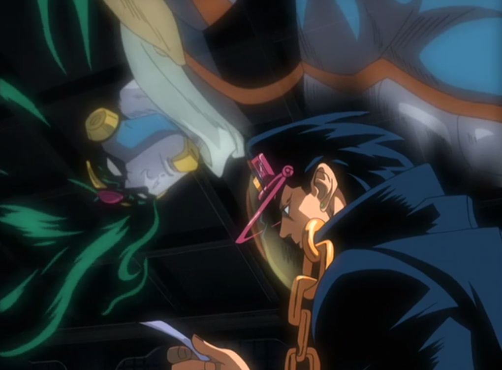 Я балдею с этого героя...То как он с суровым покерфэйсом смотрит на людей из-под козырька,как поправляет его прикрывая глаза,его стиль борьбы и блестящий ум и интуиция...Да все!Совершенно все мне нравится в этом Джотаро!