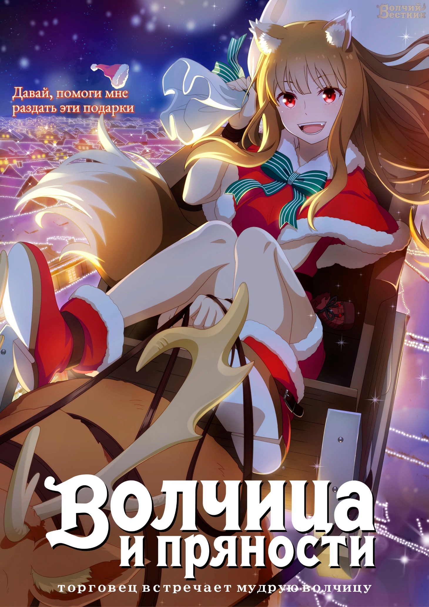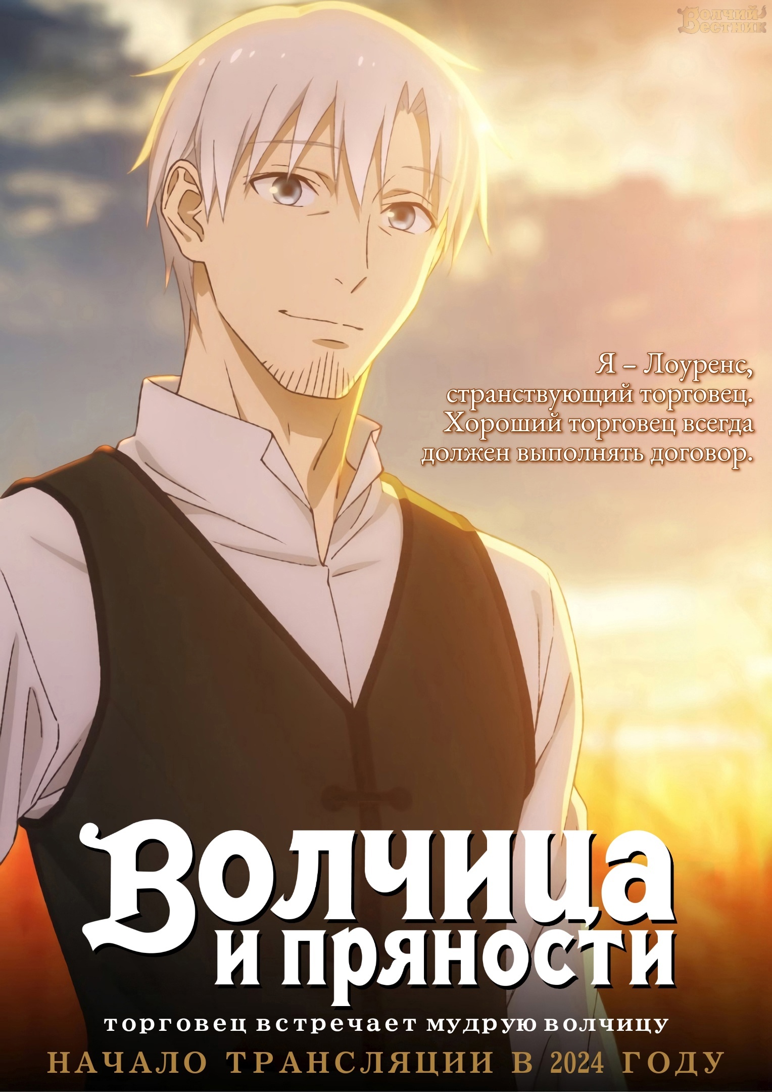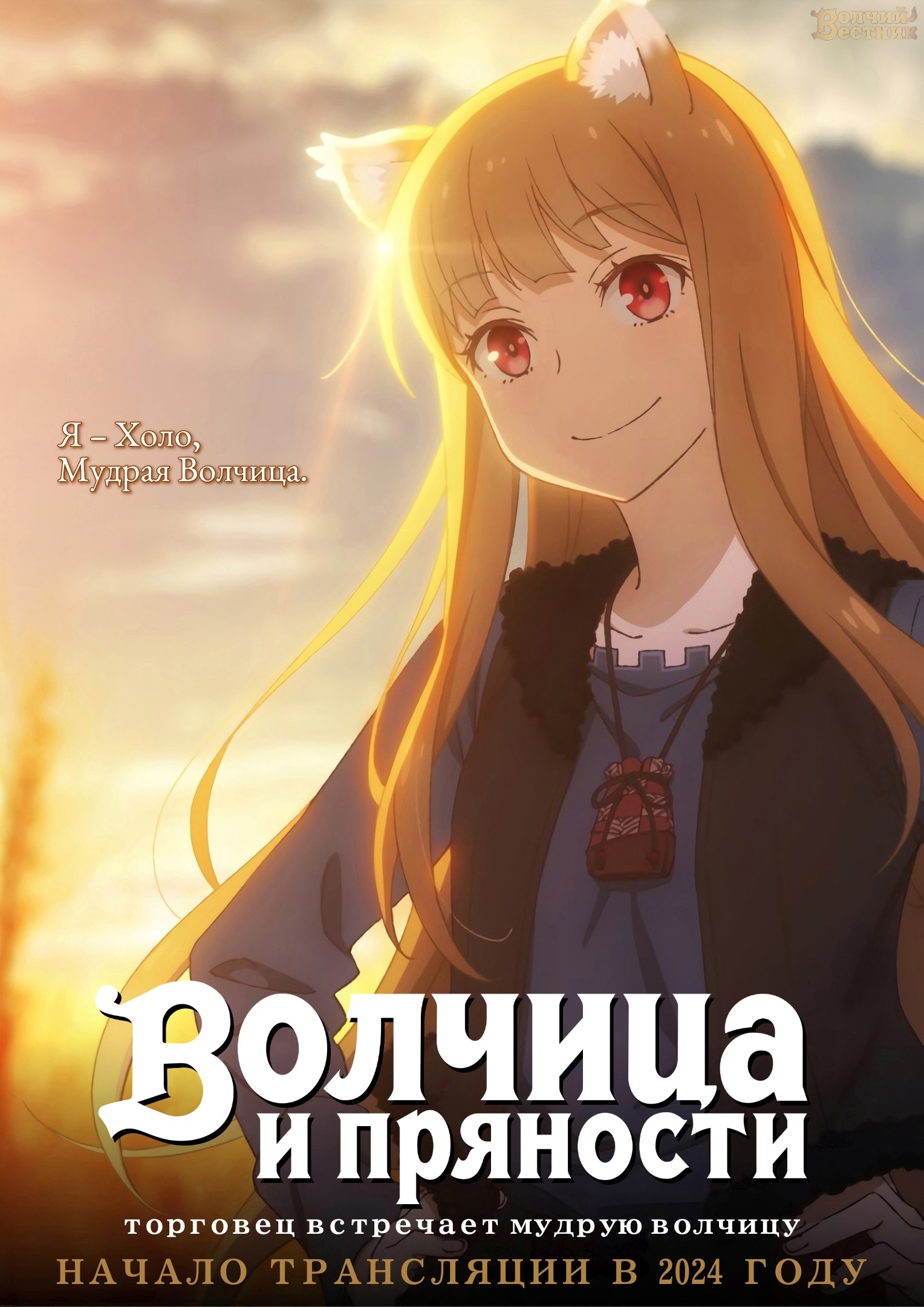 Во времена, когда леса были густы и полны дичи, а поля золотились пшеницей, по миру странствовал торговец Крафт Лоуренс. Проезжая как-то через деревушку Пасроэ в разгар праздника урожая, он обнаружил у себя в повозке необычную девушку. На голове — острые ушки, за спиной — пушистый хвост, а имя ей, по её же словам, — Волчица Холо Мудрая! Та самая богиня Холо Мудрая, некогда пообещавшая оберегать поля пшеницы, в честь которой в деревне каждый год проводят праздник! Вот только деревне Холо больше не нужна, так что она предлагает Лоуренсу сделку: торговец сопроводит её на родину, в холодные леса Ёица, а богиня во время странствий поможет ему скопить денег на собственную лавку.